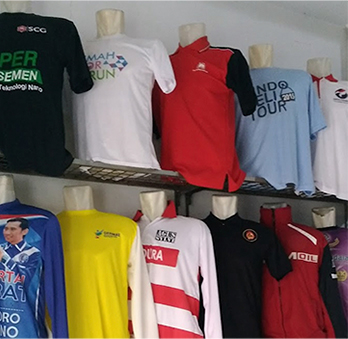 Pusat kaos – konsultasi gratis, desain, pemilihan bahan kain, produksi: potong, jahit, bordir, berbagai sablon mulai dari manual, press, digital, sampai selesai packing dan dapat dikirim ke seluruh Indonesia, maupun luar negeri.